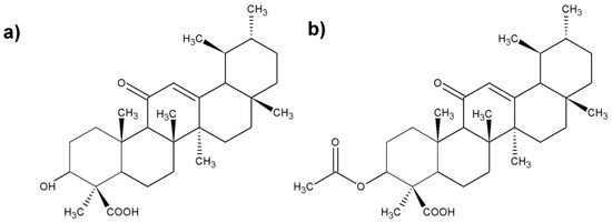 The nonvolatile fraction of frankincense is composed of pentacyclic triterpenic compounds known as boswellic acids (BAs). This group of nonvolatile molecules is generally produced by plants in the genus Boswellia. According to Buchele et al. [19], BAs mainly include four members: β-boswellic acid (β-BA), acetyl-β-boswellic acid (ABA), 11-keto-β-boswellic acid (KBA), and 3-O-acetyl-11-keto-β-boswellic acid (AKBA) (Figure 3).