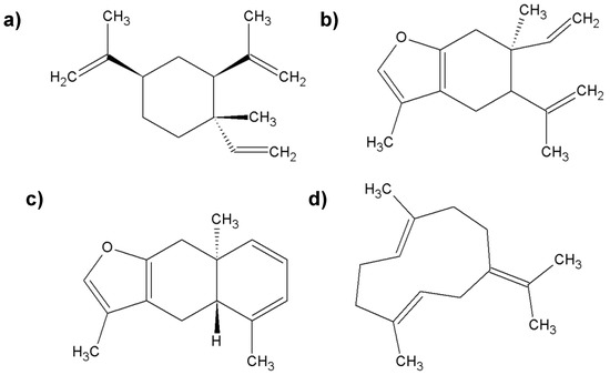 The most important chemical compounds found in myrrh; (a) β-elemene; (b) curzerene; (c) furanoeudesma-1,3-diene; (d) germacrene-B.