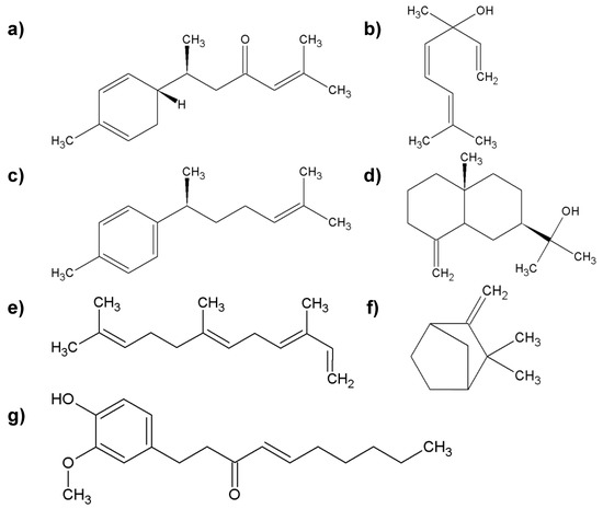 Fresh ginger is more effective in combating diseases and other illnesses than dried ginger. The health properties of ginger are mainly influenced by phytonutrients, which include volatile and nonvolatile compounds. The first group consists of monoterpenes and sesquiterpenes: α-zingiberene, zingiberol, α-farnezene, β-bisabolen, camphene, cineol, linalool, limonene, geraniol, terpineol, and ar-curcumene (Figure 6). The second group consists of zingerone, gingerols (e.g., 6-gingerol and 10-gingerol; they are responsible for the pungency of fresh ginger), and shogaol (determines the pungency of dried ginger), which originate from the dehydration of gingerols [51,52].