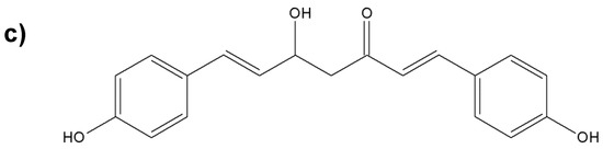 Currently, turmeric and its biologically active ingredients are intensively studied worldwide. Turmeric has been found to have anti-inflammatory [104], antioxidant [105], anticancer [106], antidiabetic [107], and antimalarial activities [108]. In traditional medicine, this plant is used as a laxative, carminative, and digestive aid. It is also used to treat fever, gastritis, food poisoning, respiratory tract infections, hypercholesterolemia, hypertension, jaundice, urinary tract infections, rheumatoid arthritis, and skin diseases and to relieve menstrual pain [99,109]. Turmeric is classified by the US Food and Drug Administration (US FDA) as a nutraceutical that is considered to be safe and has GRAS status [103]. The yellow color of turmeric is due to the presence of curcuminoids [110], which usually constitute 3%–5% of turmeric preparations. Turmeric alcohol extract contains three main curcumins, i.e., turmeric (also known as curcumin I or diferuloylmethane), desmethoxycurcumin (curcumin II), and bisdesmethoxycurcumin (curcumin III). Most commercial preparations of turmeric found under the name “curcumin” are a mixture of curcumin (approximately 77%), desmethoxycurcumin (approximately 18%), and bisdesmethoxycurcumin (approximately 5%) [102] (Figure 8).