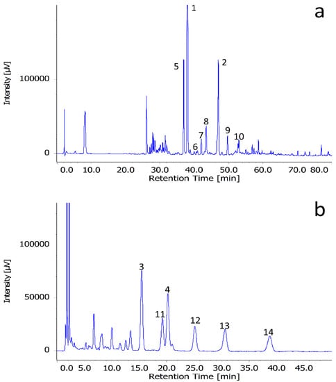F50 and F80 samples were dissolved in MeOH and injected (5 μL) into a reverse-phase HPLC-PDA system consisted of Jasco PU2089 intelligent pump equipped with a JASCO MD-2010 plus detector and a Jasco CO-2065 Plus column oven (Tokyo, Japan). Reversed phase column (Cosmosil 5C18-MS-II, 4.6 ID × 150 mm, particle size of 5 μm) was used and the temperature was controlled at 35 °C. F50 was performed using mobile phase contained 0.5% HCOOH in H2O (A) and acetonitrile (B), and the following gradient was used: 10% B for 10 min, 15% B at 30 min, 25% B at 45 min, 35% B at 55 min, 45% B at 60 min, and 55% B at 70 min. F80 was performed using 20% MeCN and 0.5% HCOOH in water on isocratic condition. The flow rate was set to 1 mL/min, and detection was performed at 254 nm. Chromatograms of F50 and F80 as shown on Figure 1a,b.