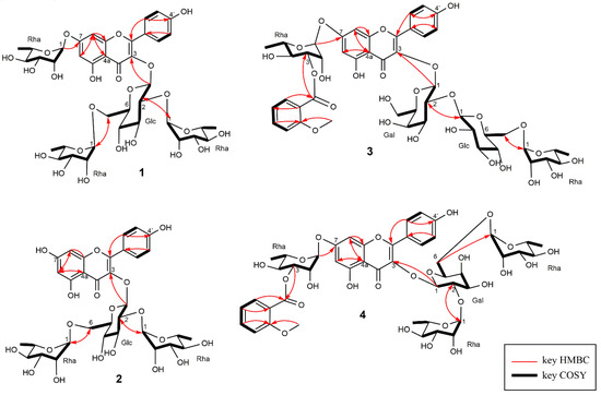 Based on HR ESI-MS data (m/z 1037.3076 [M + H]+), 3 was assigned the formula of C47H56O26 (calcd. for [C47H57O26]+, 1037.3138) and was concluded to have the same aglycone (kaempferol) as 1 and 2. 1H NMR and homonuclear correlation spectroscopy (COSY) data suggested the presence of an aromatic moiety other than that of kaempferol, which was identified as anisoyl on the basis of 13C NMR, HMQC, and HMBC data. Four sugar moieties were identified based on the signals of four anomeric protons at 5.63, 4.77, 4.51, and 5.63 ppm. Two methyl carbons and 1H signals at 1.17 and 1.33 ppm were indicative of the existence of rhamnose, while the signals of two methylene carbons referred to position six of each hexose structure. The other two sugar units were presumed to be galactose and glucose by the coupling constant at C5 position. HMBC cross peaks between the carbonyl carbon (167.38 ppm) and the proton signal at 5.34 ppm showed the presence of an anisoyl group bonded to the C3 position of rhamnose. Moreover, HMBC cross peaks also allowed one to deduce the connection sequence of two hexose moieties and rhamnose (terminal position). Anomeric proton of rhamnose (4.51 ppm) was connected to C6 (62.56 ppm) in the glucose structure, while its anomeric proton (4.77 ppm) was connected to C2 (80.14 ppm) in the galactose structure so that those three sugars were connected sequentially. Galactose was bound to the C3 position (135.15 ppm) of kaempferol through its anomeric proton (5.28 ppm).