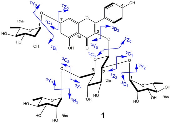The fragmentation patterns (in particular, the neutral loss) of each pseudo molecular ion were used to identify the type and number of sugar residues (Figure S21–S34). Fragments of 1 (Table 2, Figure S21) with m/z 741.2214 and 595.1542 corresponded to neutral losses of 146 and 292 Da from the pseudomolecular ion with m/z 887.28434 ([M + H]+), i.e., reflected the loss of two rhamnosyl residues. In addition, the fragment at m/z 433.0958 corresponded to a neutral loss of 454 Da, i.e., to the loss of two rhamnose and glucose units. This data suggested that two rhamnose units bonded to the glucose unit attached to the C3 position. It was because fragmentation occurs most easily in the C3 position in the positive mode. [23,24]. The fact that the relative abundance of 3Y1+ (m/z 595.1542) exceeded that of 3Y2+ (m/z 741.2214) suggested that one rhamnose was (1→2) linked to the glucose, while the other rhamnose was connected in a (1→6) linkage [23,24,25].