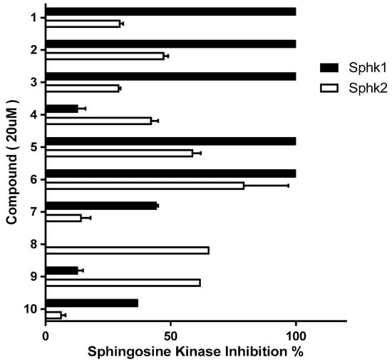 Once synthesized, compounds 2–10 were treated with 20 μM using a sphingosine kinase assay kit to measure SK1/2 inhibition (Figure 2). Compounds 8–10, which contained an introduced hydroxyl group, showed a weaker SK1 inhibitory effect. Among compounds 2–7 (which contained the introduced hydrogen and fluorine), the SK1 inhibitory effects reduced in compounds 4 and 7, which also contained an introduced 4-hydroxypiperidine. As a result, it was confirmed that the backbone structure of the polar phenol group replacing methylbenzene in the PF-543 structure reduced SK1 inhibition. Compounds 2 and 5, which had the same headgroups as PF-543, and compounds 3 and 6, which had the same headgroups as compound 22c (Figure 1), inhibited 100% of SK1 similar to PF-543 (at the same concentration). Compounds 4 and 7 had a 4-hydroxypiperidyl headgroup and displayed significantly reduced SK inhibition. This indicates that the pyrrolidine structure is an effective headgroup in PF-543 analogs compared with the piperidine structure. The SK inhibitory effects of compounds 2, 3, 5, and 6 indicated that the presence of the tolyl group in the PF-543 structure did not alter the inhibitory effects of SK.