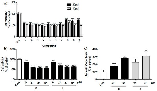 Cytotoxic effects of PF-543 (1) and derivatives (2–10) in cancer cells. (a) Cell viability was measured in HT29 cells treated with 20 and 40 μM PF-543 and derivatives. (b) Compound 5 and PF-543 were treated in HT29 cells. (c) Apoptotic cells were stained with annexin-V-FITC (fluorescein isothiocyanate). * p < 0.05, ** p < 0.01, *** p < 0.001compared with control cells.