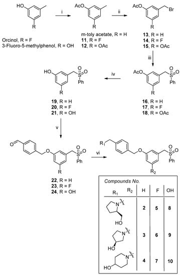 First, compounds 11 and 12 were synthesized by protecting the hydroxyl groups of the starting materials with acetyl. To synthesize PF-543 derivatives that had been modified from toluene to benzene, a reaction was carried out using commercially available m-toly acetate. Compounds 11 and 12 and m-toly acetate were brominated with N-bromosuccinimide, and sulfonyl groups were introduced using benzenesulfonyl sodium salts. After deprotecting the acetyl groups of the obtained compounds (16–18), compounds 22–24 (containing aldehyde) were synthesized using 4-(bromomethyl)benzaldehyde in the same manner as PF-543. Previous results reported by Pfizer revealed slightly elevated SK1 inhibitory effects and selectivity of PF-543 derivative with a hydroxypyrrolidine head group (22c; Figure 1) [15]. In addition, some SK inhibitors with an introduced piperidine head group demonstrated high SK1 selectivity and anticancer activity (RB005; Amgen82; Figure 1) [4,8]. These results indicate that the structure of the head group of SK inhibitors is highly important for SK1/2 selectivity and anticancer activity. Therefore, we introduced (R)-prolinol, (S)-(-)-3-hydroxypyrrolidine and 4-hydroxypiperidine into compounds 22–24 using reductive amination. Finally, compounds 2–10 with PF-543 containing benzene, fluorobenzene, and phenol were obtained.