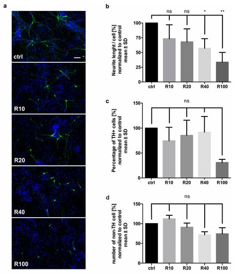 Dose-dependent effect of different rotenone concentrations (10 nM, 20 nM, 40 nM, and 100 nM) on primary mesencephalic neurons: (a) Representative micrographs of dopaminergic midbrain neuron cultures 48 h after the treatment with rotenone labeled against tyrosine hydroxylase (TH) (green). Cell nuclei were stained with DAPI (blue); Scale bar = 50 µm. (b) Rotenone lesioning effect on the neuritic network: Mean neurite length per cell was measured in six visual fields and normalized to control (ctrl). (c) Percentage of TH-positive cells in rotenone treated cultures normalized to control. (d) Number of non-TH cells in cultures treated with different rotenone concentrations normalized to control. Bars represent mean ± SD. ns: not significant. * p < 0.05, ** p < 0.01. R10 = 10 nM, R20 = 20 nM, R40 = 40 nM and R100 = 100 nM rotenone respectively.