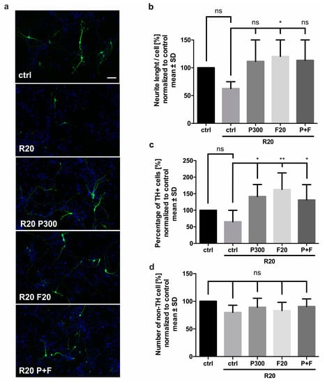 Effect of Rho-associated protein kinase (ROCK) inhibition and short chain fatty acid (SCFA) on rotenone treated dopaminergic neurons in six independent experiments. (a) Representative micrographs of TH+ dopaminergic neurons (green) and unspecific cell nuclei (blue) under different conditions. Cultures were treated with 20 nM rotenone (R20) and 300 µM propionic acid (P300) or 20 µM Fasudil (F20) or the combination (P+F); Scale bar = 50 µm. (b) Quantification of the neuritic outgrowth of dopaminergic neurons. Measured in six randomized visual fields per condition normalized to the control (ctrl). (c) Percentage of TH+ cells under the described conditions. (d) Number of non-TH cells normalized to the ctrl. Bars represent mean ± SD. TH = tyrosine hydroxylase. ns = not significant. * p < 0.05, ** p < 0.01.
