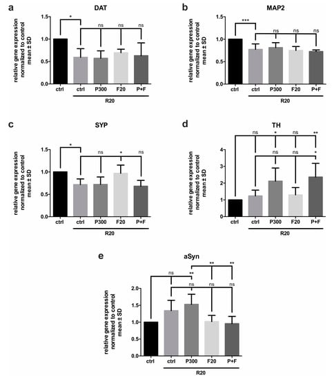 Relative gene expression after treatment with propionic acid (P300) and Fasudil (F20) under 48 h rotenone (R20) exposure in six independent experiments. (a–f) Quantification of gene expression compared to housekeeping gene β-actin and normalized to the control (ctrl). Presented are (a) dopamine transporter (DAT), (b) microtubule associated protein (MAP) 2, (c) synaptophysin (SYP), (d) tyrosine hydroxylase (TH), and (e) alpha Synuclein (aSyn). Bars represent mean ± SD. ns = not significant. * p < 0.05, ** p < 0.01, *** p < 0.01.