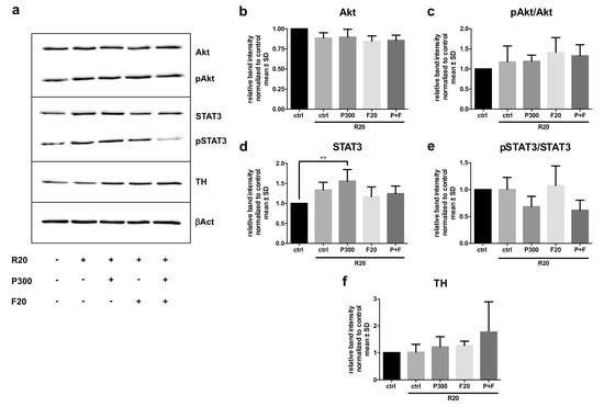 Activation of neuroprotective and neuroregenerative signaling pathways in midbrain dopaminergic neurons treated with or without 20 nM rotenone (R20) and 300 µM propionic acid (P300) and 20 µM Fasudil (F20). (a) Representative immunoblots showing the regulation of Akt, pAkt, signal transducer, and activator of transcription (STAT3), pSTAT3, tyrosine hydroxylase (TH), and β-actin (βAct). 10 µg protein per condition were used. (b–f) Intensity of immunoblot bands from five independent experiments for (b) Akt, (c) pAkt/Akt ratio, (d) STAT3, (e) pSTAT3/STAT3 ratio, and (f) TH compared to βAct and normalized to the control (ctrl). Bars represent mean ± SD. ** p < 0.01.