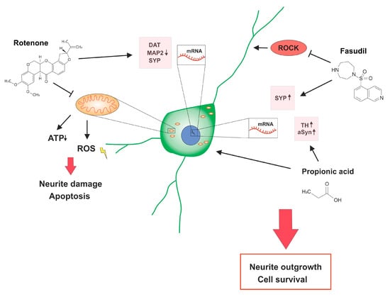 Rotenone toxicity and neuroprotective effects of propionic acid and Fasudil on dopaminergic neurons. Rotenone inhibits the mitochondrial respiratory chain which leads to decreased adenosine triphosphate (ATP) levels, oxidative stress through reactive oxygen species (ROS) and ultimately to neurite damage and apoptosis. Gene expression levels of the dopamine transporter (DAT), microtubule associated protein 2 (MAP2), and synaptophysin (SYP) were reduced under rotenone treatment. Propionic acid increased tyrosine hydroxylase (TH) and alpha Synuclein (aSyn) gene expressions, while treatment with the Rho Kinase (ROCK) inhibitor Fasudil led to increased SYP gene expression. Both treatments had positive effects on neurite outgrowth and cell survival under rotenone toxicity.