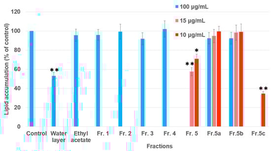 Effect of each fraction isolated from Moringa seeds on lipid accumulation during the differentiation of 3T3-L1 adipocytes. Fr. 5b and Fr. 5c were identified as compounds 1 and 2, respectively, using LC-MS and NMR. (* p < 0.05 vs control, ** p < 0.01 vs. control). Data are expressed as mean ± SD (n = 3).