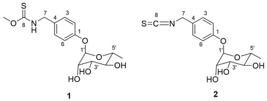 Chemical structures of 1 (niazinin B) and 2 (4-[(α-L-rhamnosyloxy)benzyl]isothiocyanate).