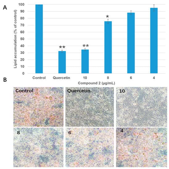 Inhibition of compound 2 on intracellular lipid accumulation. (A), Quantification of intracellular lipid using Oil Red O staining assay (* p < 0.05 vs. control, ** p < 0.01 vs. control). Data are expressed as mean ± SD (n = 3). (B), Images of Oil Red O staining 3T3-L1 cells after incubated with different concentrations (10, 8, 6, and 4 µg/mL) of compound 2 taken by an Olympus IX73 microscope (Tokyo, Japan) at 200× magnification. Quercetin (50 µg/mL) was served as a positive control.