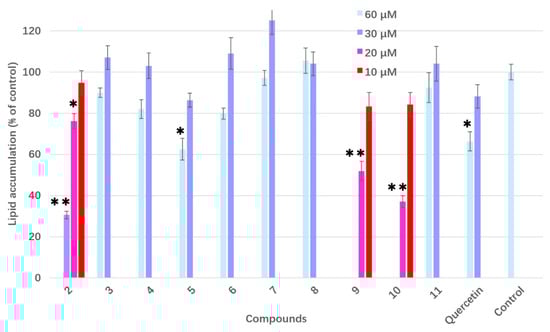 Effects of each ITC on lipid accumulation (* p < 0.05 vs. control, ** p < 0.01 vs. control). Higher concentrations of compounds 2, 9, and 10 showed a significant cytotoxicity. Quercetin was served as a positive control. Data are expressed as mean ± SD (n = 3).
