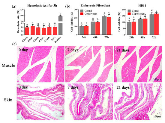 Safety of the PLGA-PEG-PLGA hydrogel. (a) The blood compatibility of the material was studied by a hemolysis test. We cultured the chicken blood with 0.5, 0.4, 0.3, 0.2, 0.1, and 0 mL polymer solution (original concentration was 20%) for 3 h, and distilled water was chosen for the positive control to induce hemolysis. (b) The cytotoxic test results in the chicken embryonic fibroblast and HD11. (c) After intramuscular or subcutaneous injection, the muscle and skin from the injection site were collected for the hematoxylin-eosin (HE) staining to observe the inflammatory cell infiltration. The results are expressed as the mean ± SD of three independent experiments. Bars with different superscripts mean significant differences (p < 0.05).