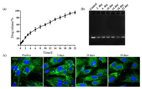 To evaluate the sustained release property of the hydrogels for the DNA vaccine, we constructed the HN gene of NDV into the pVAX1 plasmid then enveloped 0.5 mg·mL−1 of the recombined plasmid (pVAX1-HN) in the hydrogel; the release profile was evaluated using the membrane-free dissolution method. As shown in Figure 3a, the PLGA-PEG-PLGA hydrogel could continuously release plasmids for 22 days, with a cumulative release rate of 95.07% and an effective drug loading of 0.47 mg·g−1. The release media of pVAX1-HN from the hydrogel were collected at different times. The electrophoresis image showed that the plasmid structure was intact and not degraded (Figure 3b). When the release media were transfected into the HD11 cells, the immune fluorescence results revealed that the biological activity of the plasmids remained constant during the release process (Figure 3c).