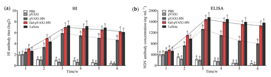 Humoral immune response assay of the NDV DNA hydrogel vaccine. The chickens were inoculated with PBS, pVAX1 plasmids, pVAX1-HN plasmids, and pVAX1-HN plasmids encapsulated in the hydrogel (Gel-pVAX1-HN) and commercial attenuated vaccine (LaSota), then the serum samples were collected at each predetermined time for the hemagglutination inhibition test (a) and ELISA assay (b). The results are expressed as the mean ± SD of three independent experiments. Bars at the same week with different superscripts mean significant differences (p < 0.05).