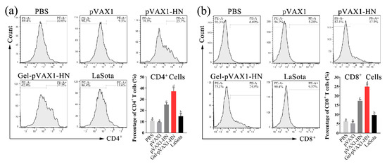 The concentrations of IL-2, IL-4, and IFN-γ were determined in serum collected at different times after immunization. Meanwhile, the peripheral blood lymphocytes were isolated and cultured to determine the proliferation activity. As shown in Figure 5a–c, the secretion of IL-2, IL-4, and IFN-γ was significantly promoted and maintained at high levels for a long time. The proliferation activity of lymphocytes was significantly higher than that of the naked plasmid group as well as the commercial vaccine group (p < 0.05). To further measure the cellular immune levels of the immunized chickens, the percentages of CD4+ and CD8+ T cells in the peripheral blood lymphocytes were determined. The flow cytometry results showed that the percentage of CD4+ and CD8+ T cells in the Gel-pVAX1-HN group at the third week were significantly higher than in the other groups (Figure 6a,b). These results suggest that the NDV DNA hydrogel vaccine induced a strong cellular immunity and remained at a high level for a period of time.