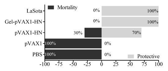 Protective efficacy of the immunized chickens against the highly virulent NDV strain. Chickens in all groups (n = 10) were challenged with the highly virulent NDV strain; after 14 days, the protection and mortality rates were recorded.
