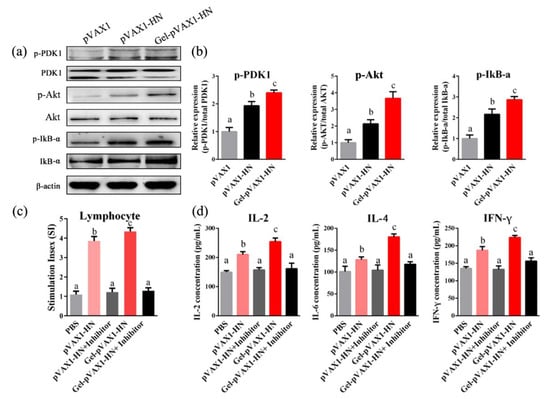 PLGA-PEG-PLGA vaccine delivery system activated the PI3K/Akt pathway in lymphocytes. (a) Lymphocytes isolated from the immune chickens’ blood and the protein levels of the PI3K/Akt pathway were detected by a western blot analysis. (b) Relative protein expressions. The effects of the PI3K inhibitor on the lymphocyte proliferation (c) and cytokine production (d). Lymphocytes from the pVAX1-HN and Gel-pVAX1-HN groups were cultured with or without LY294002 (1 μM) for 48 h, and the lymphocyte proliferation abilities and the concentrations of immune cytokines were compared. The results are expressed as the mean ± SD of three independent experiments. Bars with different superscripts mean significant differences (p < 0.05).