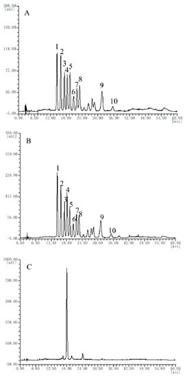 HPLC fingerprints of six batches of bilberry extracts from different manufactures were obtained (representative chromatogram is shown in Figure 1B and detailed chromatograms are listed in Figures S7–S12). Since elution program 1 in this study was the same as the elution program of international commercial standard for bilberry extract SW/T 2-2013 [25], 10 characteristic peaks of the bilberry reference extract were identified according to international commercial standard directly, without preliminary identification of the reference standard extract. The HPLC fingerprints of six batches of bilberry extract from different regions were obtained, selected, and matched by the Similarity Evaluation System for Chromatographic Fingerprint of Traditional Chinese Medicine (Version 2004A). Among these, five batches were in good accordance with that of the reference extract (Figure 1A), but one batch (A6) only showed one characteristic peak (Figure 1C), indicating that it might not be the genuine bilberry extract and needs further inspection by other technologies, such as HPLC-MS.