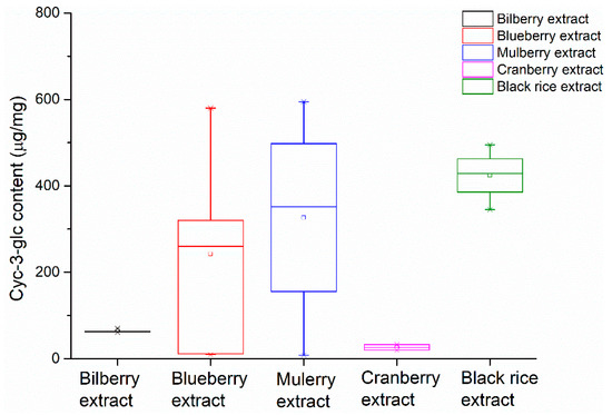 The Cy-3-glc contents in several batches of bilberry extracts, blueberry extracts, mulberry extracts, cranberry extracts, and black rice extracts were determined and presented in a whisker plot. A whisker plot is suitable to show the quantitative differences between the extracts. It can be clearly seen in Figure 6 that extracts from different origins had different Cy-3-glc contents for the blueberry extract, mulberry extract, cranberry extract and black rice extract samples, which were in the range of 8.3–594.5 μg/mg. Meanwhile, in bilberry extract samples, the Cy-3-glc contents were similar, which were in the range of 62–77 μg/mg. According to the HPLC analysis, these extracts contained fewer kinds of anthocyanins, where Cy-3-glc was the main anthocyanin component. As for cranberry extracts, these contained minimal Cy-3-glc content: 18.7–33 μg/mg.
