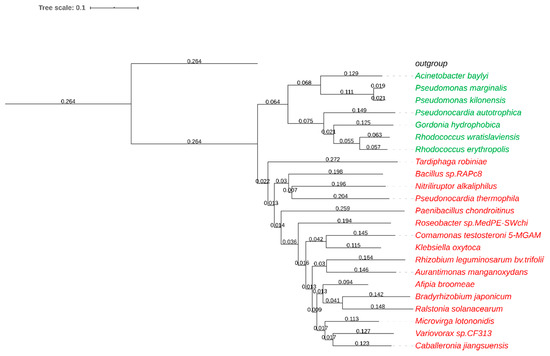 Phylogenetic relationship of nitrile hydratase (NHase) α-subunits based on a protein distance analysis with T-COFFEE (Version_11.00.d625267) and visualization with iTOL (Version 5.5.1) [12]. Rhodococcus erythropolis amidase (Uniprot: P22984.2) served as the outgroup. Iron-type NHases are displayed in green, cobalt-type NHases in red.