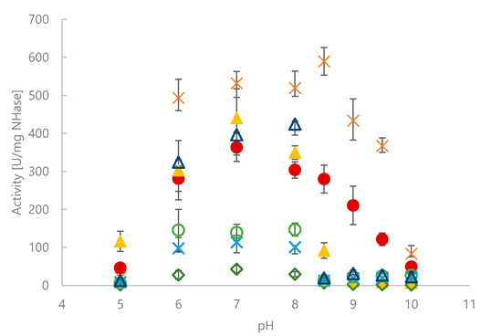 Activities of NHase CFEs for MAN hydrolysis at different pH values and 25 °C. Citrate-phosphate buffer pH 5–6, sodium phosphate buffer pH 7–8, Tris-HCl buffer pH 8.5, carbonate buffer pH 9–10. CtNHase: filled dark red circles. KoNHase: filled orange squares. NaNHase: filled yellow triangles. GhNHase: green rhombs. PkNHase: light green circles. PmNHase: blue crosses. ReNHase: dark blue triangles.