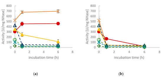 In view of future applications, the operational stability of the enzymes is an important parameter. Therefore, the NHase containing CFEs were incubated at 37 °C and 50 °C, respectively. Residual activity was determined after 1 and 6 h, respectively. As shown in Figure 4a, CtNHase and KoNHase retained full activity when incubated at 37 °C, whereas all other NHases were deactivated to some degree upon incubation (Figure 4a). The effect was even more pronounced upon treatment at 50 °C. This temperature was only tolerated by CtNHase to some extent (Figure 4b).