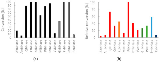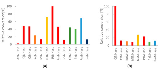 To extend the structural scope of substrates, we furthermore looked into the capability of the NHases to convert the unsaturated cinnamic acid nitrile (4a) [24]. Of all NHases, CjNHase showed clearly outstanding activity for compound 4a (Figure 6b). For 3a, CjNHase showed only little activity (Figure 6a) and for 2a, the enzyme was good, but not excellent (Figure 5b). A much less pronounced trend was observed for compound 3a, which was hydrated to a high degree by Co-dependent CtNHase, RmNHase and PtNHase, but also by the Fe-dependent PmNHase. The heterocyclic pyrazine nitrile 2a, was converted very efficiently by seven NHases of both types. A concentration of 5 mM pyrazine-2-carbonitrile (2a) could, for example, be fully hydrated by only 9 µg/mL KoNHase in the reaction mixture within less than 5 min. Similarly, 12 µg/mL CtNHase produced 5 mM of 3b and 10 µg/mL CjNHase 5 mM of 4b.