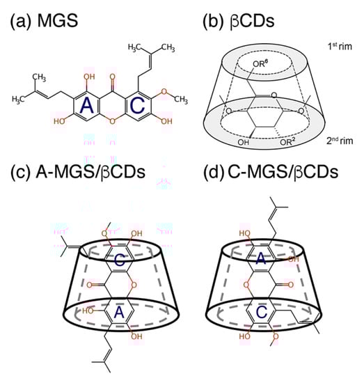 Alpha-mangostin (MGS; Figure 1a) is a major component of xanthones extracted from pericarps or fruit hulls of mangosteen (Garcinia Mangostana L.) [1,2], and exhibits a wide range of pharmacological properties [3,4], including antibacterial [5], antioxidant [6], anti-inflammatory [7,8], and anticancer activities [9,10,11]. More specifically, the antimicrobial activity of MGS targets the cell membrane of Gram-positive bacteria [12]. Unfortunately, the low water solubility of MGS leads to its limitation in pharmaceutical applications, particularly at high concentrations [13]. There are several methods to improve the water solubility of the lipophilic MGS molecule and to enhance the compound penetration through the biological membrane. One such powerful technique is the modification of the native MGS molecule with some functional groups, such as amines and triazoles, which leads to an amphiphilic MGS with an increased solubility [14,15]. Another approach is the construction of complex formation with cyclodextrins (CDs), which is a commonly used method to promote the water solubility of numerous hydrophobic molecules [16,17,18]. Note, that the truncated cone shape structure of CDs gives the potential to encapsulate small hydrophobic molecules and consequently improve their stability and biological activity [16,19].