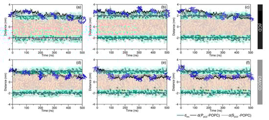 In the case of the βCD molecule, one simulation showed that βCD was able to adsorb on the membrane surface, but not penetrate into the inner membrane (Figure 2b). From the distance plot in Figure 2b, it was noticed that the βCD stayed at a distance of around 2.6 nm from the lipid center over the course of the simulation time. Although βCD was capable of translocating from the water layer into a somewhat deeper region of the lipid bilayer, βCD still preferred to locate at a position close to the lipid polar head groups at 1.8 nm, as shown in Figure 2a,c, respectively. In contrast, DMβCD translocated from the outer lipid surface into the deeper hydrophobic region of the POPC membrane within the first 100 ns (1.00–1.05 nm in Figure 2d–f) in comparison to the βCD system. Thus, it implied that it was easier for DMβCD to permeate into the inner membrane than it was for βCD, most likely owing to the higher hydrophobicity of its lipid tails. However, the MD results within a time scale of nanoseconds did not reveal the complete penetration of CDs through the membrane [47], and there was no example of the permeation of CDs across the cellular membrane.