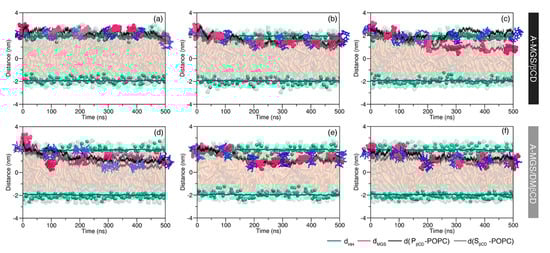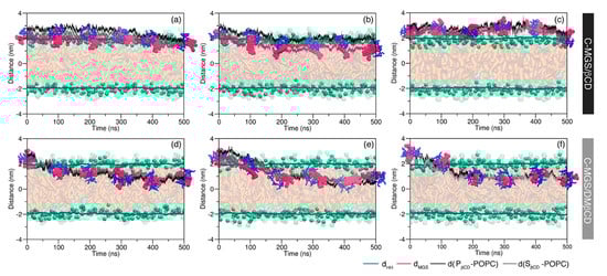 To investigate the permeability of free MGS, free βCDs, and MGS/βCDs inclusion complexes across the POPC membrane, triplicate MD simulations were performed under the NP(z)AT ensemble for 500 ns, where the MD results are given in Figure S1 (SI) and Figure 2, Figure 3 and Figure 4. These simulations showed that the A-ring of free MGS in both forms (A- and C-MGS) firstly dipped into the POPC membrane, whilst the C-ring pointed towards the water layer (Figure S1). After the insertion process of the A-ring, the MGS molecule stably located at 0.9–1.0 nm above the center of the lipid bilayer (z = 0 nm). More interestingly, the findings suggested that the MGS molecule can penetrate into and be stable in the POPC membrane deeper than into the mixed POPE/POPG membrane by ca. 0.5 nm, as previously reported [12], and also that the MGS was rapidly inserted into the lipid acyl chain of the POPE/POPG membrane, and the isoprenyl group on A-ring of the xanthone scaffold was the first entering group and interacted with the inner lipid surface mainly through hydrophobic interactions [12]. The slight difference in permeable behavior of the free MGS across the membrane may arise from the different model used for constructing the lipid membrane compared to in this study.