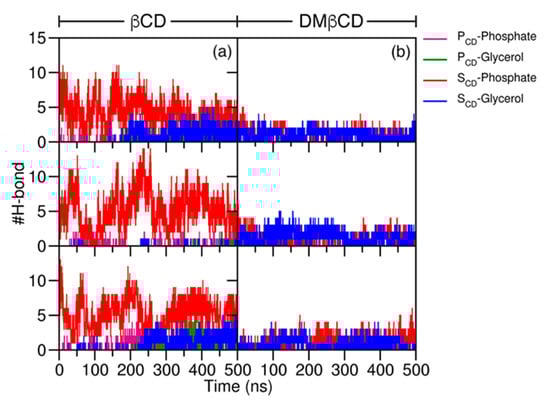 To determine the interaction of free βCDs with the lipid surface, the number of hydrogen bonds (H-bond) between each rim of βCDs and the lipid head groups (i.e., phosphate and glycerol ester groups) was monitored and plotted versus the simulation time (Figure 5). The triplicate MD simulations showed that the SCD of the native βCD was the main area to interact with the polar head groups of the POPC membrane via H-bond formations (Figure 5a). A number of H-bonds formed between the SCD of βCD and the phosphate groups of POPC were up to 14, while the PCD of βCD displayed a relatively low number of H-bonds. Moreover, the number of H-bonds between the SCD of βCD and the glycerol ester groups was increased up to 4, possibly after the βCD adsorption on the POPC membrane and rearrangement of its orientation to firmly form with the interior membrane. Instead, the SCD of DMβCD only formed H-bonds with the glycerol ester groups of the POPC membrane, corresponding to the more stable orientation and the deeper position of DMβCD inside the inner membrane (Section 2.1).
