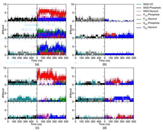 Apart from the adsorption of free βCDs on the lipid surface, the interaction of the MGS/βCDs complexes with the lipid membrane was also investigated by the H-bond analysis. The results suggested that both the A- and C-MGS inclusion complexes exhibited H-bond interactions of SCD with the polar head groups of the POPC membrane due to the adsorption process onto the lipid membrane, like in the case of their free form (Figure 6a–d). Specifically, the third MD simulation of A-MGS/βCD, as depicted in the bottom panel of Figure 6a, suggested that the MGS molecule can form H-bonds with the glycerol ester groups better than the other simulations, probably owing to the dissociation of MGS from the βCD cavity into the hydrophobic region of the POPC membrane, as supported from the distance analysis in Figure 3c. For A-MGS/DMβCD in Figure 6b, the major H-bond interactions came from the interactions of the glycerol ester groups with the SCD of DMβCD and the MGS molecule, reflecting the permeation of the inclusion complex into the inner membrane. In addition, one simulation revealed no H-bonds between MGS and DMβCD, as a result of the release of MGS out of the DMβCD cavity (top panel of Figure 6b), while the H-bond interactions between C-MGS and βCDs still existed. These results were related to the higher steric hindrance of C-MGS/βCDs on the lipid surface than that of A-MGS/βCDs, leading to a lower probability of the MGS molecule moving out of the βCDs hydrophobic pocket. Therefore, we concluded that the number of H-bonds for each system corresponded to the preferential position on the lipid bilayer. The SCD was the main interacting region for forming H-bonds with the polar head groups of the POPC membrane. Moreover, we confirmed that the A-MGS conformation in complex with βCDs was more likely to be liberated from the βCDs cavity and then inserted into the inner membrane than the C-form of MGS.