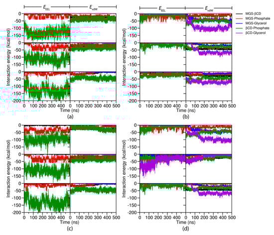 To determine the key interaction energy of the inclusion complexes with the lipid membrane, the time evolution of the non-bonded electrostatic (EEEL) and van der Waals (EvdW) interactions between the lipid head groups and the MGS inside two βCDs was plotted (Figure 7). The results showed that the EEEL interaction was the main interaction of the two (A/C)-MGS/βCD inclusion complexes with the lipid membrane (Figure 7a,c). The EEEL energy between the βCD and phosphate groups of the POPC membrane had an average value of −125 kcal/mol, which was much less than the EvdW energy. However, the interaction energy between βCD and the glycerol polar groups of the POPC membrane could not be observed. In the case of the MGS molecule, it was also more favorable to interact with the phosphate groups of the lipid membrane than with the glycerol ester groups via a similar magnitude of both EEEL and EvdW interactions. Conversely, the MGS and DMβCD molecules in the MGS/DMβCD complex formation interacted with both the phosphate and glycerol ester groups of the POPC membrane. The EvdW interaction played a major role in the binding of (A/C)-MGS/DMβCDs to the lipid bilayer (Figure 7b,d). The time-dependent plots for the non-bonded interaction energies suggested that the EvdW energy of the glycerol ester groups with DMβCD and MGS slowly decreased over the simulation time. This was the result of the permeation of the complexation into the inner membrane (glycerol ester groups). Altogether, these findings were associated with the predominant location of the complex on the lipid membrane, which was consistent with the other structural analyses (Section 2.1 and Section 2.2).