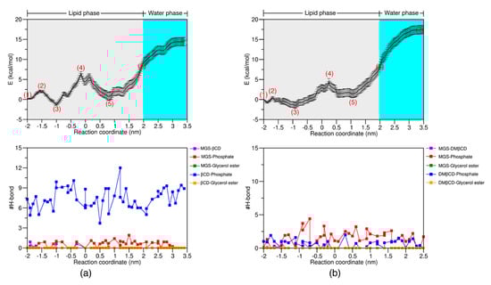 Similarly, for the MGS/DMβCD complex, the first energy minimum was detected at z = −0.9 nm with an energy value of −2.0 kcal/mol (Figure 8b). Afterwards, the free energy value was increased to 4 kcal/mol when the MGS molecule located close to the center of lipid bilayer (z = 0.2 nm). After the permeation of MGS across the bilayer center, the second energy minimum was found at z = 1.1 nm with an energy barrier of 1 kcal/mol. To push the MGS through the lipid bilayer, the high energy barrier (16.5 kcal/mol) was investigated in the aqueous phase, similar to that seen in MGS/βCD system. These results are also in good agreement with the energy profile of MGS passing through the lipid bilayer, as mentioned above.