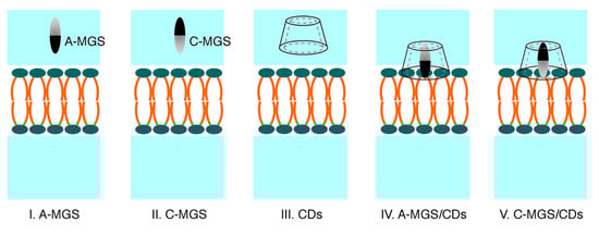 Recently, information on the permeation of MGS at different concentrations at the lipid membrane was derived from MD simulation [46], where the hydrophobic association of the isoprenyl moiety of MGS with the lipid alkyl chains was the main driving force for the transfer of MGS across the lipid membrane bilayer [12]. An example of the permeability of MGS into a mixed type of membrane (i.e., palmitoyleoyl phosphatidylglycerol (POPG)/palmitoyleoyl phosphatidylethanolamine (POPE)) was determined [12]. However, the dissociation mechanism of the MGS from the CDs cavity followed by the transfer of MGS from the aqueous phase to the biological membrane has not been fully resolved yet.