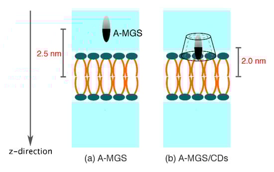 Schematic models of each system for MD umbrella sampling simulations: (a) free A-MGS is initially set by placing in the water phase, while (b) the inclusion complexes were positioned at the polar head groups of the POPC membrane.