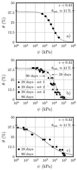 The matric suction values in each specimen were calculated using Equation (1), proposed by ASTM D5298 [23], while Equation (2), proposed by Van Genuchten [36], was adopted to adjust a theoretical curve to the experimental data, of the variation of the volumetric water content (θw) as a function of the suction (ψ) value. In these two equations, ‘ω’ represents the filter paper water content, ‘θs’ the saturated volumetric water content, ‘θr’ the residual volumetric water content, and a, b and c are fitting parameters. After obtaining these parameters, it is possible to predict the volumetric water content and, thus, the water content, for any suction value, and vice versa [37,38].