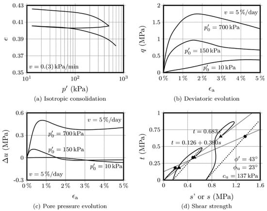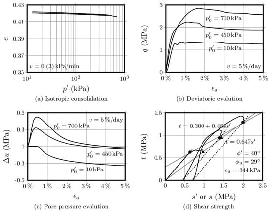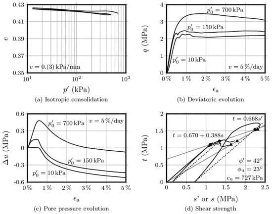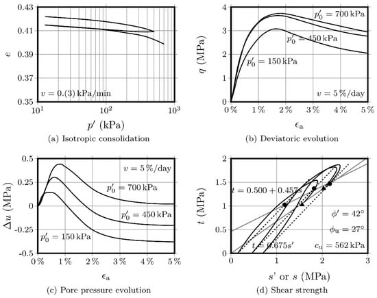 Figure 3 and Figure 4 show the results obtained with the OPC-S specimens, after 28 and 90 days curing, respectively. Regarding the isotropic compression, it is interesting to observe that the volume change, as measured by the variation of the voids ratio, is significantly lower than the variation presented by the AAC-S specimens. Additionally, the strength increase, after 28 days, was also significantly higher than that obtained with the activated FA materials. This is not surprising, given that the Portland cement has a higher strength increase rate than fly ash-based alkaline cements [1,14]. The influence of the curing period in Portland cement, after 28 days, is negligible, while alkaline cements develop a very significant portion of their final compressive strength after 28 days curing. Therefore, it is not surprising that the variation in voids ratio was very small between the 28 and the 90-day mark, especially when compared with the variation shown by the AAC-S material, for the same curing interval.