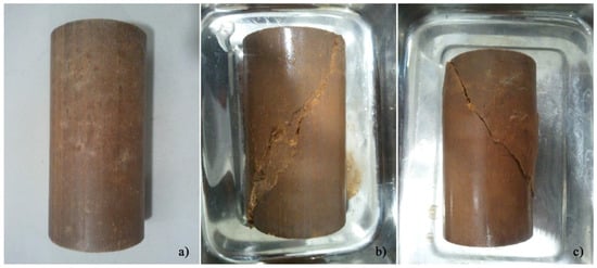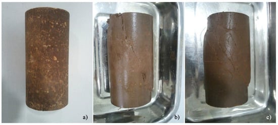 General condition of the AAC-S specimens: (a) before testing; (b) after testing, with 90 days curing, consolidated to 450 kPa; (c) after testing, with 90 days curing, consolidated to 700 kPa.