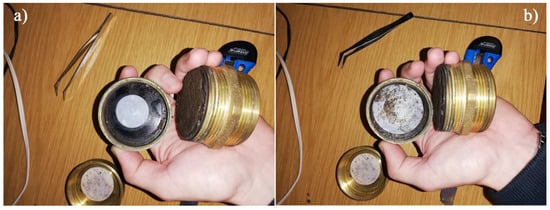 The variation in the soil matrix suction, which is a function of the degree of saturation, has a direct influence on its shear strength and bearing capacity, as well as on its stiffness [19,20,21]. Soil matrix suction was determined by the filter paper method, following the procedures recommended by ASTM D5298 (2016). Nine cylindrical specimens were prepared for each batch, with 52 mm in diameter and 20 mm in height. The test procedure consisted of measuring the water absorbed by the specimen using an impermeable lateral mould, to prevent any moisture exchange with the atmosphere. After curing, the specimens were oven-dried, at 110 °C, for 24 h, after which two concentric circular filter papers (with 30 mm and 50 mm in diameter) were applied at the base of the specimen (Figure 9), and a 40 mm diameter filter paper was applied at the top.