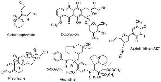 The literature reports several treatment protocols for ATLL with variable results. The treatment strategy depends on ATLL subtype. Some protocols employ chemotherapy, with the use of ziduvidine (AZT)/interferon-α (IFN-α) and hematopoietic stem cell transplantation, which may occur in association or not depending on the aggressiveness of the disease [14]. The AZT/IFN-α association allowed good results, considering the acute, chronic, and indolent forms of ATLL, since the immunological effect of IFN-α is associated with the cytostatic effect of AZT on lymphoid cells [15]. The most-used treatment in the face of the lymphomatous and acute clinical forms of ATLL (more aggressive) is the use of the CHOP cocktail: (C) cyclophosphamide; (H) hydroxyldaunorubicin (doxorubicin); (O) oncovin (vincristine); and (P) prednisone. Cyclophosphamide is an alkylating agent that causes the formation of cross-links with deoxyribonucleic acid (DNA), hydroxyldaunorubicin damages DNA by inserting itself between the bases (intercalating agent), oncovin prevents cell duplication through binding to tubulin protein, and prednisone acts on cytokines (inflammatory process) [13]. Figure 1 shows the structures for CHOP and AZT chemotherapeutic drugs.