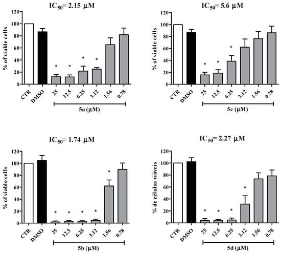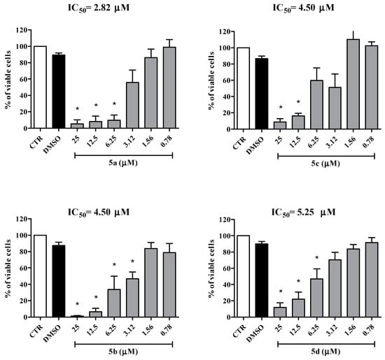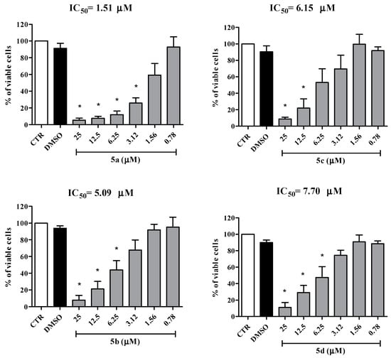 Effect of mesoionic compounds 5a–d on Jurkat cells. Cells were incubated in the presence or absence of 5a–d (0.78–25 µM) at 37 °C in a humid atmosphere containing 5% CO2. After 72 h, the cells were incubated with MTT for 3 h under the same conditions. Then, cells were centrifuged and DMSO was added to dissolve the crystals formed by the MTT reduction. Bars represent mean ± SEM values of % of viable cells from 4 to 5 independent experiments. * p < 0.05 were considered statistically significant compared to control and DMSO.