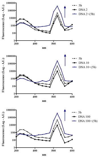 It is known that mesoionic compounds can interact with the DNA molecule and their biological activity can be related with this interaction [32,58]. Based on this, the interaction of compounds 5a–d with DNA was investigated using spectroscopic analysis. The fluorescence emission spectra of pure DNA and the corresponding DNA complex with the mesoionic compounds under study are shown in Figure 6 for 5b, whereas Figure S5 in the Supplementary Material shows the DNA assays for 5a, 5c, and 5d. The experimental results suggested that only compound 5b can interact with the DNA strands; however, the mechanism of this interaction remains unknown, and more tests are needed to indicate its nature.