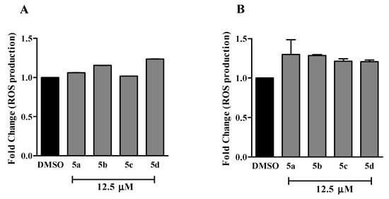 Effect of mesoionic compounds 5a–d on reactive oxygen species (ROS) production. Jurkat (A) and MT2 (B) cells were incubated with or without 5a–d (12.5 µM) at 37 °C in a humid atmosphere containing 5% CO2. After 30 min, the cells were washed and incubated with the ROS probe DHR (Dihydrorhodamine 123). Then, the fluorescence was examined using flow cytometry. A total of 10,000 events was acquired for the experimental data. Bars represent mean ± fold change of ROS production (DMSO was considered as a control) from two independent experiments.