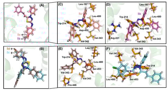 Superposition of the best docking pose for (A) HSA:5a/5b and (B) HSA:5c/5d in the subdomain IIA (site I). Representation of the main amino acid residues from the HSA structure, which can interact with (C) 5a, (D) 5b, (E) 5d, and (F) 5c. Selected amino acid residues and the mesoionic compounds 5a, 5b, 5c, and 5d are in stick representation in orange, beige, pink, cyan, and brown, respectively. Elements’ colors: hydrogen: white; oxygen: red; nitrogen: dark blue; sulfur: yellow; bromine: wine; and chlorine: green.