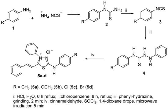 The compounds (E)-3-phenyl-5-(phenylamino)-2-styryl-1,3,4-thiadiazol-3-ium chloride derivatives (5a–d) were prepared following Scheme 1 as previously reported [23] using microwave irradiation as the power supply. Initially, the aryl-thioureas were prepared from substituted anilines and ammonium isothiocyanate in the presence of concentrated HCl and water as solvent. The aryl-thioureas obtained (2a–d) were submitted under 8 h of reflux in chlorobenzene as solvent, and the aryl-isothiocyanates (3a–d) were used immediately in the subsequent step as crude products [49] to obtain the N-aryl-2-phenyl-hydrazinecarbothioamides (4a–d). The intermediates 4a–d were prepared in solvent free conditions using a grinding method with aryl-isothiocyanates and phenyl-hydrazine at room temperature for 2 min. These compounds were obtained in quantitative yields and high purity, and their structures were confirmed by FT-IR spectroscopy and NMR 1H and 13C spectrometry, in accordance with previous publications on mesoionic compounds [29,50].